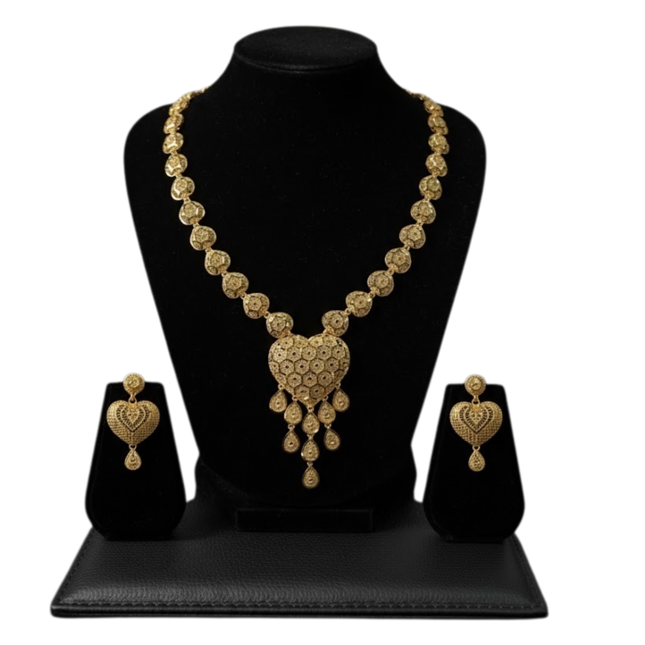 Let your style speak volumes with the Radiant Heart Drop Gold Necklace Set by Tarasha Jewels, crafted to enchant with every curve and detail. The centerpiece features a beautiful heart motif, richly adorned with intricate filigree and playful drop accents that shimmer with every movement. Matching earrings continue the theme, ensuring a harmonized and luxurious look. Whether youโre attending a grand celebration or marking a romantic milestone, this set promises to make every moment unforgettable. Created with precision and artistry, Tarasha Jewels brings a signature touch of elegance and love to your jewelry collection.