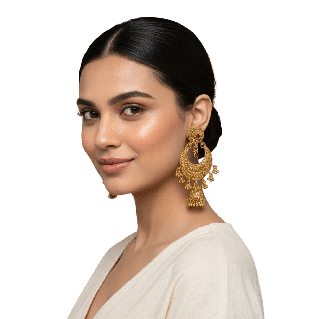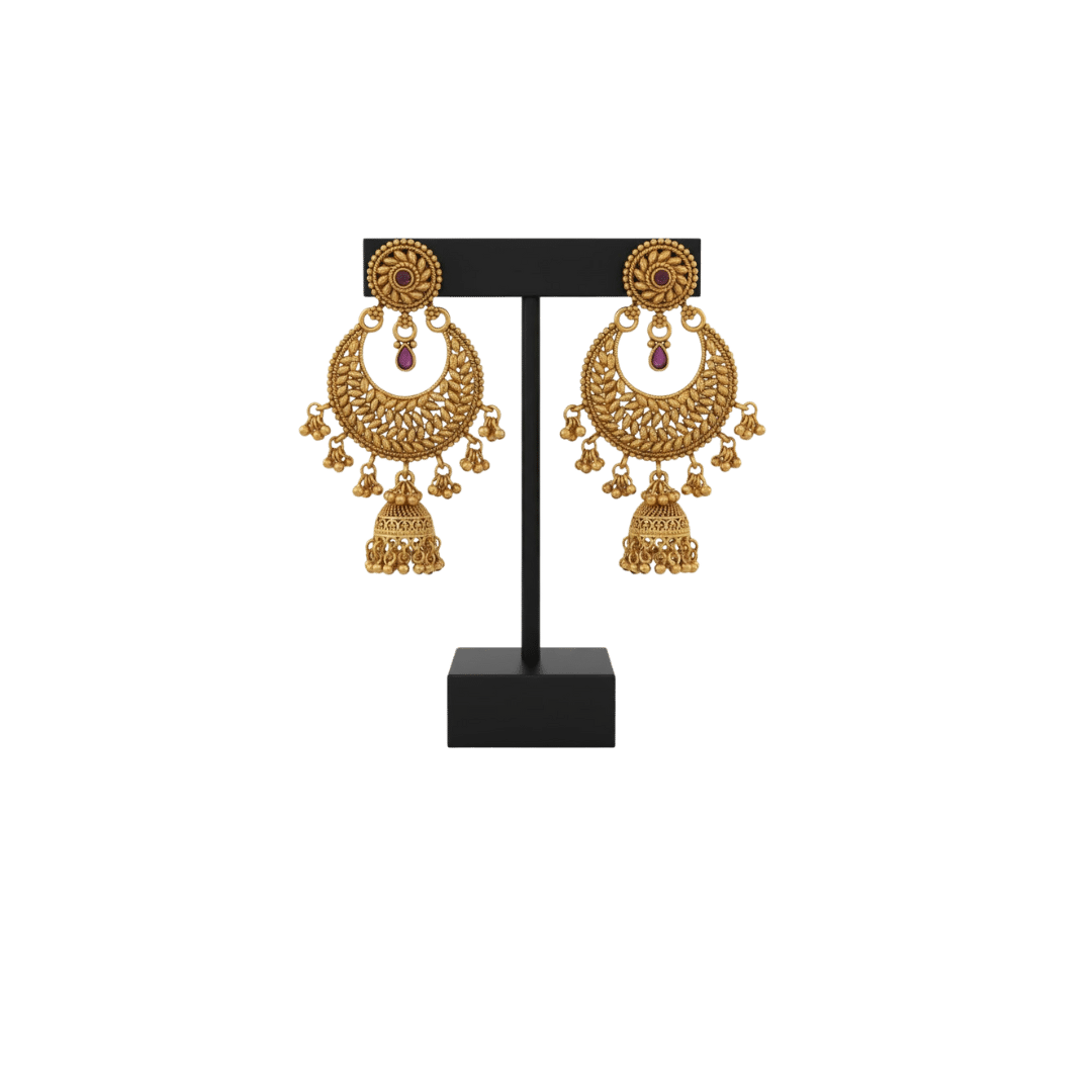 Create a vintage-inspired statement with the Vintage Crescent Bell Drop Earrings by Tarasha Jewels. These earrings showcase a dramatic woven crescent silhouette, suspended from a radiant stud with a deep ruby accent. Adorned with playful golden bell dangles and beadwork, each movement captures a melody of traditional elegance and festive joy. Lightweight and comfortable for extended wear, these earrings speak volumes for celebrations, sangeet nights, and heritage bridal momentsโcrafted to perfection by the artisans at Tarasha Jewels.